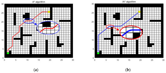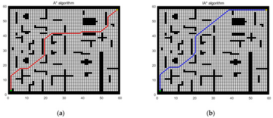 Simulation results of scene 1. (a) A* algorithm; (b) IA* algorithm.