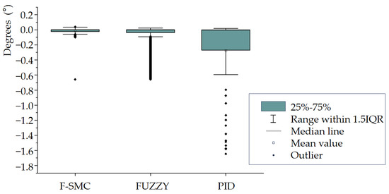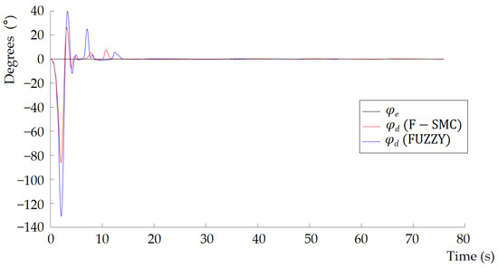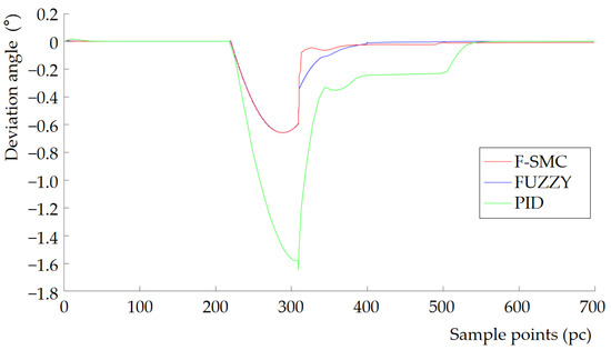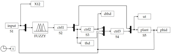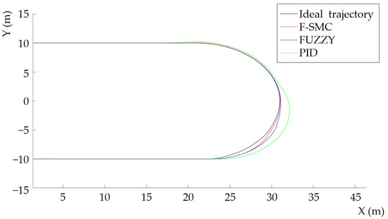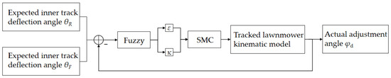 In this paper, MATLAB/SIMULINK is used as the simulation platform to verify the performance of the F-SMC controller. The tracking control of the U-turn path for a tracked agricultural machinery is conducted under the condition of no disturbance (the parameters of the control system are shown in Table 2). We compare the fuzzy controller (FUZZY), PID controller, and the proposed F-SMC controller in this paper. Among them, the parameters required by the FUZZY controller are the same as those of the F-SMC. We referred to reference [47] for the parameters for the PID controller. We designed the control system structure diagram of F-SMC (as shown in Figure 7). According to Figure 7, we establish a corresponding controller model in SIMULINK that combines the fuzzy control front-end and sliding mode variable structure control at the back end, as shown in Figure 8. In Figure 8, X12 (the expected deflection angle of the inner and outer tracks) is input to S1 (the input terminal of the F-SMC controller). After being processed by the FUZZY, the output parameters are combined to the S2 (position controller) to calculate the thd (position parameter). The thd is input to the S3 (differential controller) for differential processing and output as dthd. After being processed by the S4 (attitude controller), the ut (preadjusted deflection angle) is output. After comparing with the S5 (kinematic model of the controlled object, a tracked lawn mower), the feedback signal is output to FUZZY. The F-SMC controller integrates the S1 and S5 to output phi (the actual adjustment angle). The F-SMC controller operates continuously during the time period t.