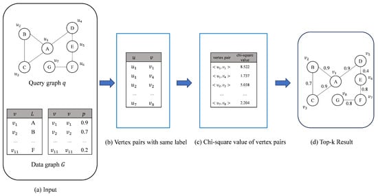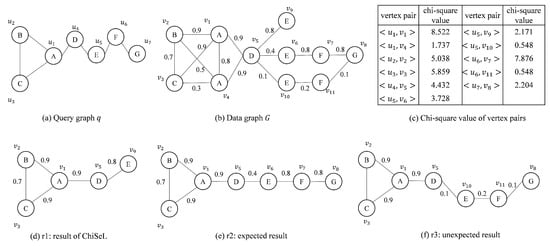 Given a query graph q and a data graph G in Figure 1, the purpose is to find the top-1 similar subgraph. The subgraph-matching algorithm on the graph is unable to distinguish the quality of the results sought and will return all results that match exactly. For this example, both results of Figure 1e,f would be returned, with the result shown in Figure 1f being of poorer quality. If the ChiSeL algorithm, which specializes in probabilistic graphs, is used, the algorithm first obtains the vertex pair chi-square values as shown in Figure 1c. Then, ChiSeL chooses the vertex pair with the largest chi-square value to start matching. When the matching process proceeds to the vertex pairs , , and generated by , the edge probabilities are different from the chi-square values of ; because ChiSeL prioritizes the vertex pair with the largest product of the edge probability and chi-square value, the vertex pair is selected to be added to the result set. Since there is no vertex in the neighborhood of that can be matched with , the matching process ends. The final top-1 result obtained by ChiSeL is shown in Figure 1d. Obviously, for this example, we prefer to obtain the result shown in Figure 1e.
