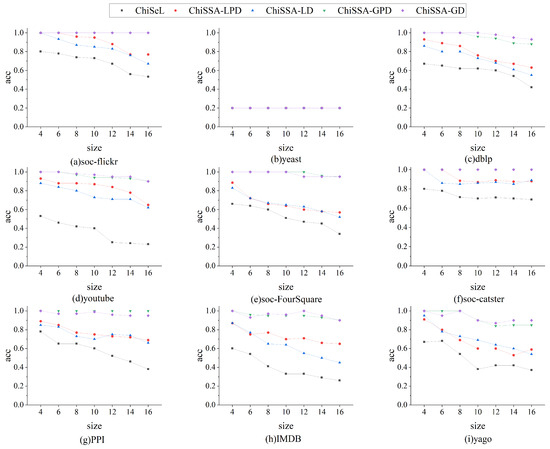 - As the query graph size increases, the accuracy of the results obtained by the five algorithms decreases, but the accuracy of the results obtained by the four ChiSSA algorithms proposed is still much higher than that of the ChiSeL algorithm. On most of the datasets, the accuracy of the results obtained by the ChiSSA algorithms can be maintained at a high level. There are two main reasons for this: first, the ChiSeL algorithm assumes that all labels have exactly the same probability of occurrence when solving for the expected value, which is not realistic. In contrast, the ChiSSA algorithm considers the specific distribution of labels when calculating the expectation value, which makes the chi-square value obtained by the ChiSSA algorithm more reflective of the similarity of vertex pairs.