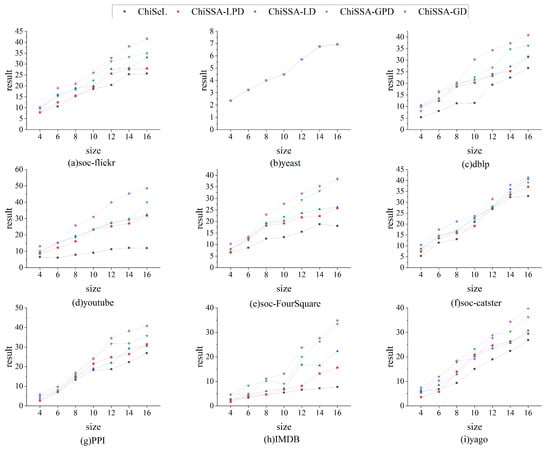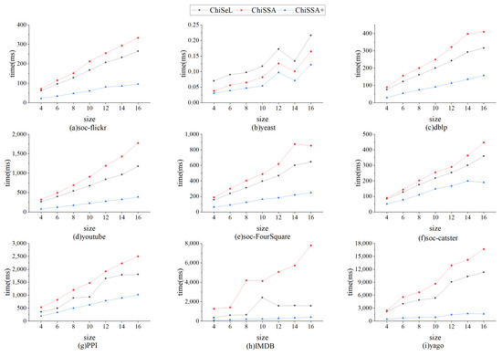 Figure 5 shows the time consumption of the ChiSeL algorithm, ChiSSA algorithm, and ChiSSA+ algorithm to compute the chi-square value for different sizes of query graphs on nine datasets, where ChiSSA+ denotes the ChiSSA algorithm optimized with neighborhood vertex filtering. According to Figure 5, there are the following observations:
