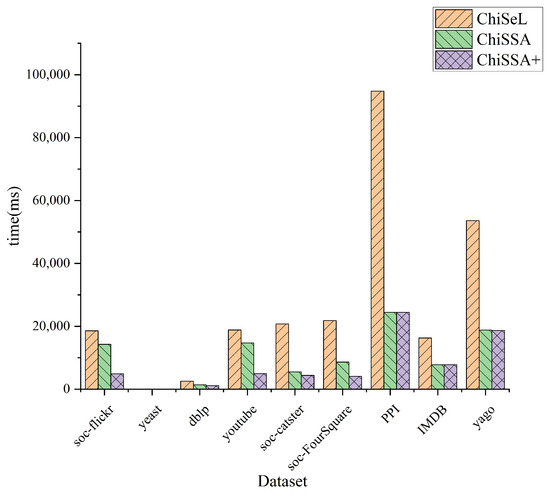 - The ChiSSA+ algorithm takes less time to run than the ChiSeL algorithm after optimization with neighbor label filtering, because the use of neighbor labels filters out more pairs of vertices, which effectively reduces the computations of the algorithm.