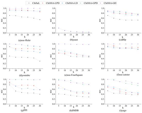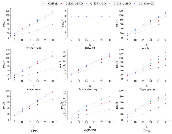 Figure 8 demonstrates the results’ probability sums. As can be seen from Figure 8, on almost all datasets, the probability sum of the results obtained by all ChiSSA algorithms is much higher than that of the ChiSeL algorithm as a whole, which is because the chi-square values obtained by ChiSSA algorithm are more effective, which in turn means they obtain results with a higher probability of existence; as the value of k increases, the probability sum of the results obtained by the ChiSSA algorithm is always higher than that of the ChiSeL algorithm.