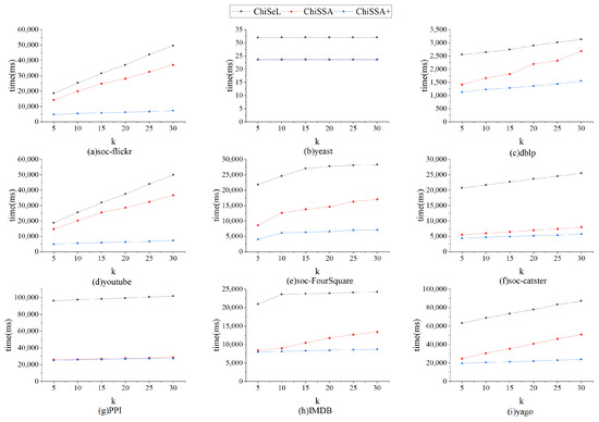 Figure 6 shows the overall running time of the ChiSeL algorithm, ChiSSA algorithm, and ChiSSA+ algorithm on the nine datasets with the parameter k set to 5 and the number of vertices of the query graph set to eight. It shows that the ChiSSA+ algorithm with filtering optimization has the highest running efficiency.