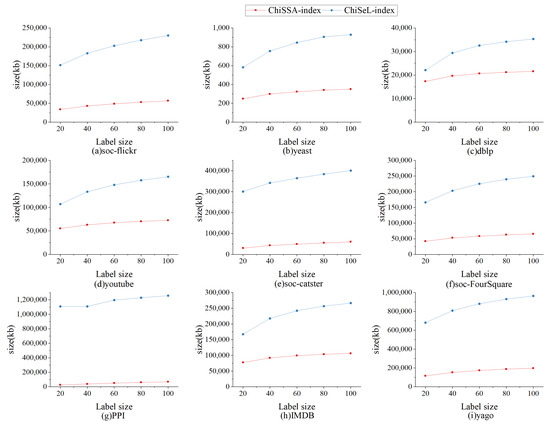 Figure 10 shows the effect of the number of labels on the index size. From Figure 10, it can be seen that ChiSSA-index outperforms ChiSeL-index on all datasets; as the number of labels increases, the index size increases, the number of neighboring label types maintained by each vertex increases also increases, and the size of the neighboring label index and neighboring label probability index increases, with a limited effect on the “label–vertex” inverted index.