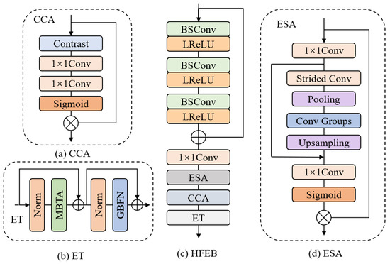 (a) The architecture of CCA block. (b) The architecture of ET block (c) The architecture of our Hybrid Feature Extraction Block (HFEB). (d) The architecture of ESA block.