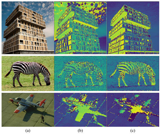 Feature map visualization results. Column (a) is the input image. Column (b) is the feature map visualization result without adding ESA and CCA modules. Column (c) is the feature map visualization result after adding ESA and CCA modules.