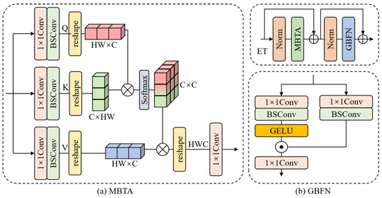 Inspired by Restormer [41], in order to achieve better global modeling capabilities, we adopt an efficient transformer module, as shown in Figure 2b, consisting of MBTA and GBFN to further improve the performance of the network. The specific structure is shown in Figure 5.