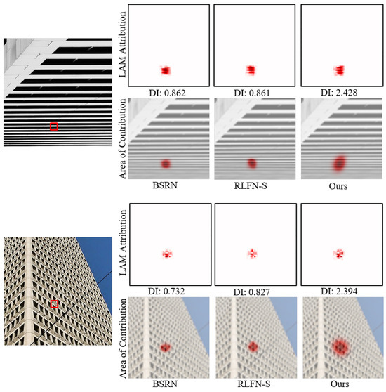 To observe the range of pixels utilized in SR reconstruction, we resort to a diagnostic tool called Local Attribution Maps (LAMs) [51], which is an attribution method specifically designed for SR. Using the LAM approach, we can identify which pixels contribute the most to the reconstruction of the selected regions. The Diffusion Index (DI) illustrates the range of relevant and utilized pixels, with a higher DI indicating a broader range of used pixels. We compare our model with BSRN [52] and RLFN-S [50], and the LAM results are shown in Figure 7. Thanks to the transformer module, RNET exhibits the widest range of pixels inferred for SR images and achieves the highest DI value. The experimental results are highly consistent with our expectations and, from an interpretability perspective, substantiate that our proposed RNET leverages the long dependencies offered by the transformer, enabling it to utilize more pixels and thus attain better performance.