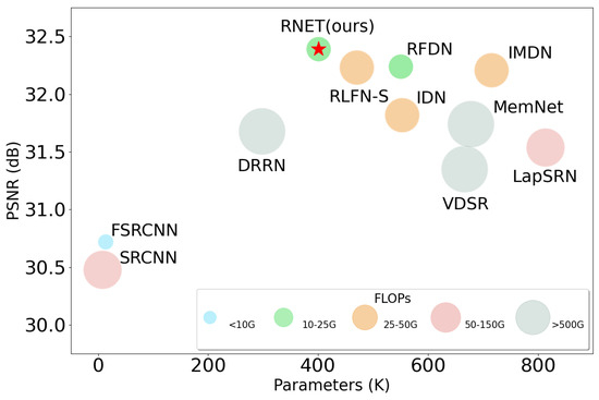 To verify the effectiveness of our RNET, we compare it with 10 advanced efficient super-resolution models: SRCNN [2], FSRCNN [18], VDSR [3], DRRN [30], LapSRN [31], LAPAR-A [19], MemNet [32], IDN [17], IMDN [22], RFDN [49], and RLFN-S [50] with scale factors of 2, 3, and 4. The quantitative performance comparison on five benchmark test sets is shown in Table 1. Compared to other advanced methods, RNET achieves the best performance for both PSNR and SSIM while reducing the parameters by 70 K compared to the second-best method RLFN-S and by 150 K parameters compared to the third-best method RFDN.