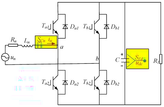 The topology of the single-phase rectifier circuit is shown in Figure 2. There are two legs in the rectifier. , stand for insulated gate bipolar transistors (IGBTs) in x-leg, and , stand for freewheeling diodes; x in these described symbols could be a and b. On the grid side, and denote the traction winding leakage inductance and resistance, respectively. represents the grid voltage and is the grid current, which is measured by the current sensor of . C is the support capacitor and is the load. is the DC link voltage; it also denotes the voltage of the capacitor and it is measured by the voltage sensor of .
