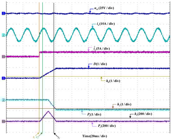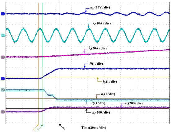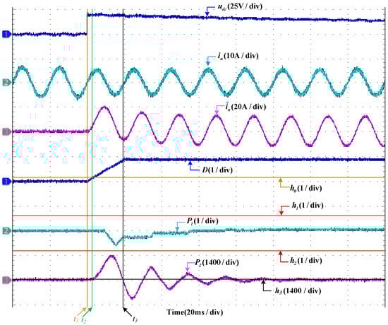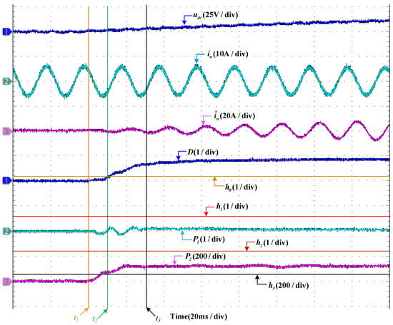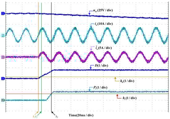 In the case when is in an offset fault, the diagnosis results are shown in Figure 4. It can be seen that, at the instant of when the system is working normally, the fault occurs. Then, the waveform of decreases from 340 V and its fluctuation becomes larger. almost does not change, which keeps the sine wave with an amplitude of 6 A. Before the fault occurs, . increases from 0 to 2 A instantly when the fault occurs. The detection function of D changes from 0 to 1 in a short time. It should be noted that the fault is detected when D surpasses at . In the second half of the period of the system after the fault is detected, both and decrease; decreases from 0 to −1 and decreases from 190 to 0. At the time when is less than and is less than simultaneously, the fault can be diagnosed at .