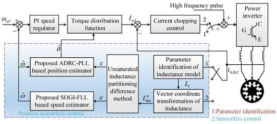 Scholars have extensively studied the position sensorless technology of SRMs and proposed various control strategies. The control schemes that are currently available can be divided into several groups [8], including the high-frequency pulse injection method [9,10], the magnetic linkage/current method [11,12,13], the model of inductance method [14,15], and the intelligent control method [16,17,18]. The high-frequency pulse injection method has been widely used during the start-up and low-speed operation phases.