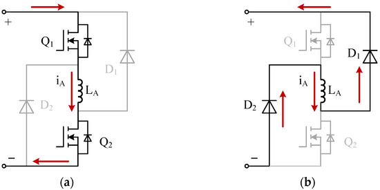 Switching tubes Q1 and Q2 turn off when the phase winding is deactivated. The winding applies a negative voltage to the bus due to its inductance of the winding. Diodes D1 and D2 provide power to the supply. Negative-voltage freewheeling is shown in Figure 2b. The expression for the equation of the voltage loop is as follows: