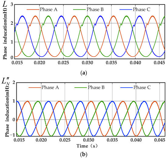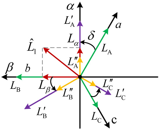 where δ is the rotation angle of a new coordinate system and is the inductance of the first coordinate transformation. The first transformed inductance is obtained after coordinate rotation. To simplify the calculation, we take the rotation angle δ as , and Equation (4) can be expressed as: