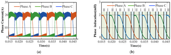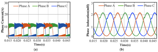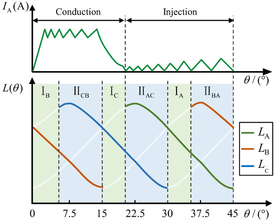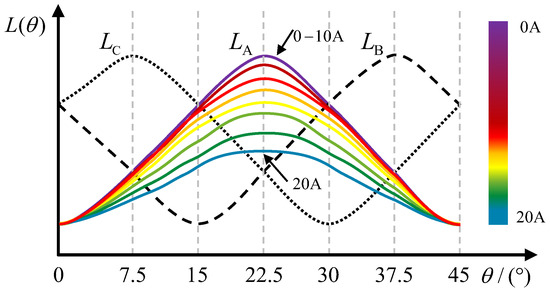 Since the SRM features a double salient pole structure, alterations in the air gap between the rotor and stator generate fluctuations in magnetoresistance, in turn inducing changes in inductance that correlate with the rotor’s position. This non-linear feature amplifies when the current reaches the saturation point of the core material. The accuracy of the position estimation algorithm may be adversely affected. A schematic diagram of the three-phase inductance in the presence of electromagnetic saturation is shown in Figure 5.