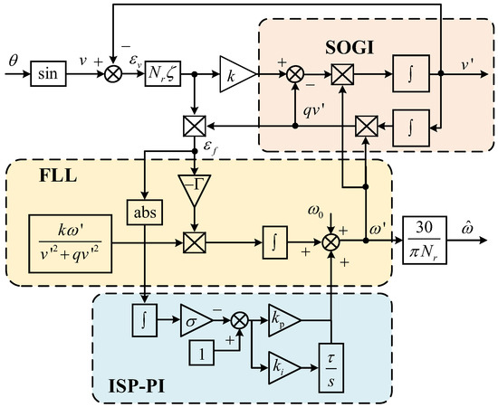 The conventional SOGI-FLL algorithm has been refined and optimized to enhance the accuracy of speed estimation and eliminate any steady-state error. The linearized SOGI-FLL-ISPPI can be divided into two components: the SOGI and the integral-separated proportional-integral FLL (FLL-ISP-PI), as shown in Figure 7.