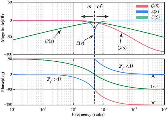 The amplitude-frequency characteristic curve of , , and is shown in Figure 8. Obviously, they can be regarded as a bandpass filter, a low-pass filter, and a trap filter, respectively. When , the mean of is zero. The input signal has neither amplitude attenuation nor phase lag compared to the output signal , and the SOGI-FLL is locked in that state. When , the error signal is in phase with the quadrature component of the output signal and the average value of is positive. When , the is in reversed-phase with and the average value of is negative.