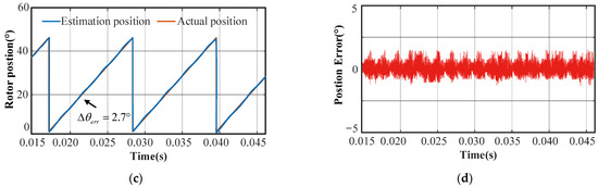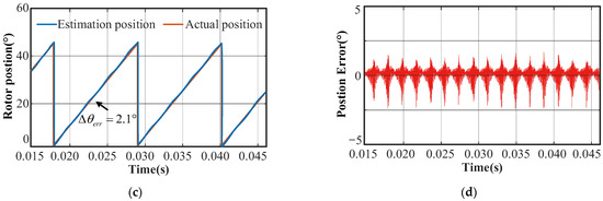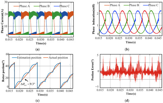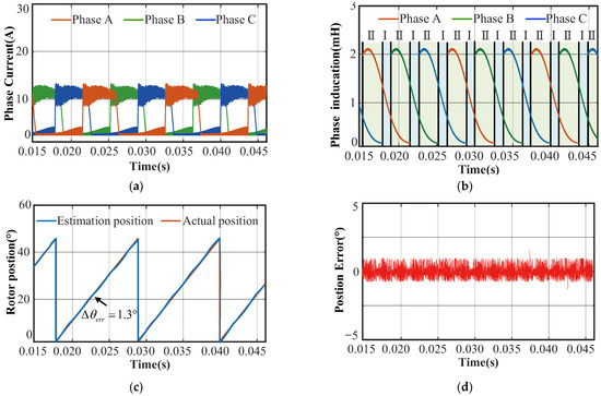 The simulated waveforms using the control scheme proposed in this paper are shown in Figure 17. The current chopping threshold in Figure 17a is about 20 A. Figure 17b shows the simulated waveforms of the three-phase inductance, where the calculation of the inductance value is carried out only when the on-phase current is less than the critical saturation current, and the region belongs to is determined according to the number of regional inductance values. It can be seen in Figure 17c,d that the maximum angular error with the control scheme proposed in this paper is about 2.7°, which is overall smoother.