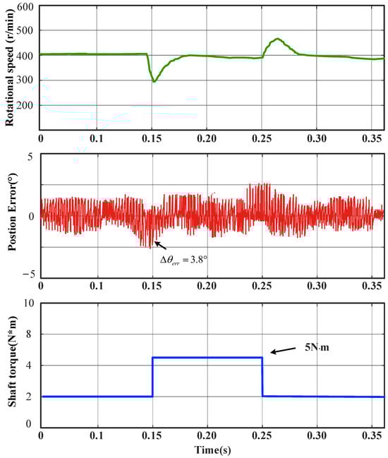 In order to simulate the actual physical torque variations and disturbances in the results, the effect of motor load jumps on system stability is simulated in the following section. With the motor running smoothly at 400 rpm, a step response signal is applied, and the system load jumps from 2 N·m to 5 N·m and back again. As shown in Figure 18, the motor speed is quickly stabilized by keeping it stable, and the rotor position estimation error is 3.8 degrees. Since the method improves the operation ability under load conditions, it can still achieve good estimation accuracy in the case of load change or external disturbance.