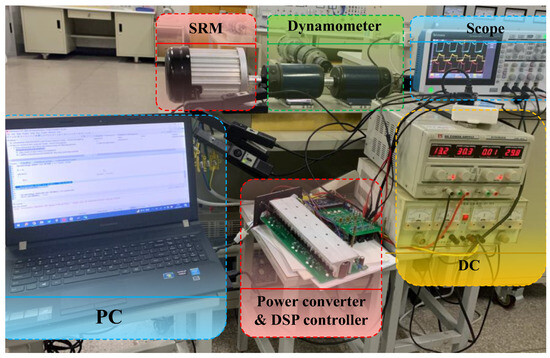 To investigate the practicality of the suggested control approach in engineering, we use a three-phase 12/8 SRM as the subject of research. We create an experimental apparatus for SRM position sensor-less control, as depicted in Figure 19. The SRM controller employs TI’s TMS320F28335 chip as the control core, and the load side utilizes permanent magnet (PM) synchronous motors. The power converter consists of a three-phase asymmetric half-bridge circuit. Through the use of the Tektronix TBS2000B oscilloscope and A622 oscilloscope probe (Tektronix, Beaverton, OR, USA), one can acquire the current measurement and estimate the waveform of the rotor position.