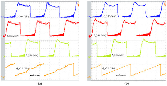 The speed of the SRM is set to 400 r/min with a load of 2 N·m. Figure 20a displays the traditional method’s waveform, which reaches a pinnacle of approximately 12 A, and the position sensor comparison yields an estimated angular error of about 3.6 degrees. On the other hand, Figure 20b depicts the waveform of the hybrid algorithm proposed in this paper, with a peak current of around 13 A and an estimated angular error of about 2.5 degrees.