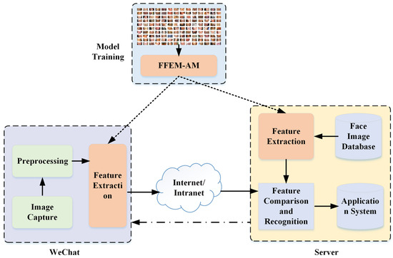 As shown in Figure 2, we propose a new framework to prevent the leakage of original facial images during transmission. With WeChat for mobile devices, the facial image is captured and preprocessed (e.g., face detection and image enhancement), and discriminative features are extracted by the FFEM-AM, which learned on facial image big data. The extracted features, rather than original facial images, are transmitted to a server for feature comparison and recognition. On the server’s end, the FFEM-AM extracted features of facial images stored in the database, and then the similarities among the features extrated by WeChat and that extracted by server’s end are measured for recognition. In the proposed framework, only the features required for recognition are transmitted over the Internet/Intranet, and this amount of information is far less than that of an original facial image, therefore, reducing the risk of personal information leakage effectively. The biggest challenge with the framework is the feature extractor, which not only has high prediction accuracy but can also be run with WeChat. The memory, computation, and development environment of WeChat are constraints. Therefore, we propose a light-weight feature extractor FFEM-AM, which is discussed in the following sections.