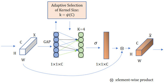 One of the most popular attention mechanisms is the Squeeze-and-Excitation (SE) module [26], which learns the weight coefficients for each channel and weights the features of different channels to achieve better feature extraction. The SE module applies global average pooling for each channel and uses two Fully Connected (FC) layers to estimate the channel weights, where the FC layers operate based on nonlinear interchannel interactions. However, the dimension reduction of features in the process may have negative effects; it is inefficient to capture the dependencies among channels, and the FC layers require many parameters. Therefore, we introduce the ECA module, optimized using SE, into the proposed FFEM-AM. The ECA replaces the FC layers in the SE with 1 × 1 convolutions, which avoids the dimension reduction in the SE. Meanwhile, it can also maintain the dimensionality in inter-channel interactions and can adaptively select the size of the 1D convolution kernel. Compared to the SE module, the ECA module not only enhances the model’s performance but also significantly reduces the model’s complexity.