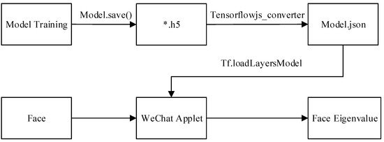 JavaScript is the most popular runtime environment for mobile devices, and we used TensorFlow.js to build the deep learning model. TensorFlow.js [27] is a JavaScript version of TensorFlow that supports GPU hardware acceleration and can run in applet environments. It not only aids in deploying well-trained models but can also be used to train models. In this work, we used TensorFlow.js v2.0 containing the tfjs-core, tfjs-converter, tfjs-layers, tfjs-backend-webgl, tfjs-backend-cpu, and tfjs-data subpackages. The localStorage cache was used in the applet to reduce the bandwidth and amount of time related to model. Figure 6 shows the development flow: Firstly, the model was trained and converted to the *.h5 model format using model.save(), where * denotes the file name. Secondly, the *.h5 model was converted into a format that can be loaded by TensorFlow.js, obtaining model.json. Finally, the related npm packages were introduced in the applet, and the model could be loaded using the tf.loadLayersModel().