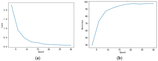 Figure 7a,b show the loss and validation accuracy during training. We can see that with the increase in training epochs, the training loss decreased and validation accuracy increased rapidly. After 25 epochs, the training loss and validation accuracy stabilized, which indicates that the proposed model converged.