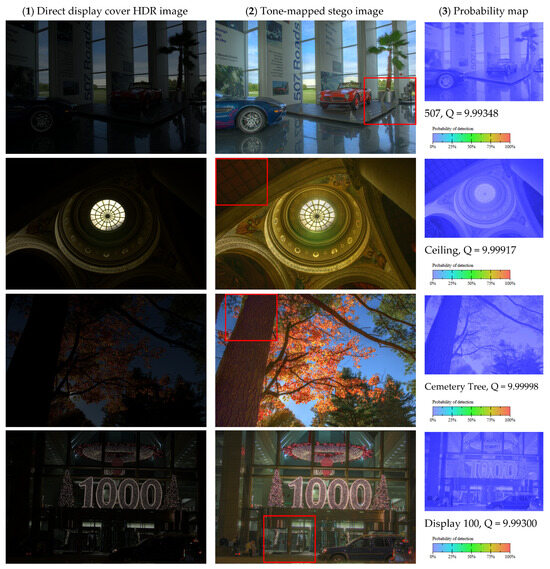 Six HDR images: (1) direct displayed HDR image, first column; (2) tone-mapped stego HDR image, second column; (3) the probability map image, third column. The blue in the probability map shows a probability of different detection of less than 5% between the cover and stego HDR image.