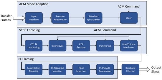 A transmitter compliant with the CCSDS 131.2-B standard executes different functions: error-control coding (based on serially concatenated convolutional coding), frame validation, transfer frame synchronization, physical layer (PL) framing, bit synchronization, and pseudo-randomization. The architecture for an encoder and modulator compliant with the CCSDS 131.2-B is described in the standard [16] and is shown in Figure 1. The figure identifies the functional blocks of the system and shows the logical relationships among them.