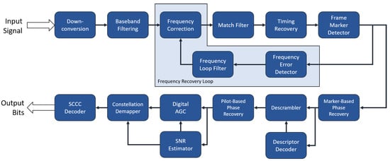 The architecture of the receiver, shown in Figure 2, has been logically divided into two main parts: the digital front-end section and the back-end section. The first one contains all the processing blocks that are responsible for recovering the signal impairments (i.e., from Frequency Correction block to Digital AGC block), whereas the back-end section only includes the generation and decoding of the soft-bit information (i.e., the Constellation Demapper and the SCCC Decoder blocks).