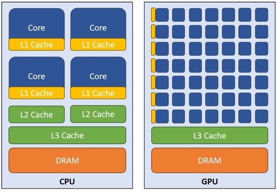 CPUs (Figure 3 left) are usually composed of a few cores (blue blocks), generally from 2 to 16, which are responsible for the parallel (or serial) execution of processes and threads. Typically, every CPU core carries out distinct tasks on distinct sets of data, with the aim of reducing the time lag between receiving an instruction and completing it. Additionally, each core handles requests of a higher priority that may arise from various peripherals, such as interrupts, exceptions, and user commands. With respect to GPUs, CPUs provide the best performance when: