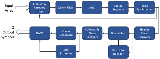 The receiver side is composed of a sequence of blocks that aims to extract and decode the information sent by the transmitting side. First, an ADC block should sample the incoming IF signal that is then down-converted to the base-band. This can be carried out for example by using a local digital quadrature oscillator. The signal is then filtered and decimated up to an integer number of samples required by the timing synchronization algorithm. The latter is used to recover the transmission clock; thus, it samples the data stream in the correct instant, to recover the amplitude and phase-modulated symbols. After that, the frame marker detector block allows the recovery of the PL frame structure by applying a correlation between the reference FM and the received bits. This is crucial to enhance the data-aided algorithms used for frequency correction and phase correction, whereas the previous blocks (i.e., timing recovery) must be capable of performing their functions without knowing the structure of the frame and in the presence of a frequency error. After compensating for the frequency impairment, the symbols are unscrambled according to the standard. This allows us to mitigate the effect of transmitter pseudo-randomization, re-establishing pilot values. At the same time, the descriptor decoder, analyses the FD of the frame, identifying the presence/absence of pilots and the ModCod used. The last part of the architecture is preceded by the estimation of the signal-to-noise ratio (SNR) and the correction of the amplitude of the symbols to match the reference constellation. This step is needed to compute the log–likelihood ratio (LLR) of the received bits by the constellation demapper module. Finally, the SCCC decoder uses this soft-bit information (i.e., the LLRs) to recover errors in the satellite transmission and produce the information bits.
