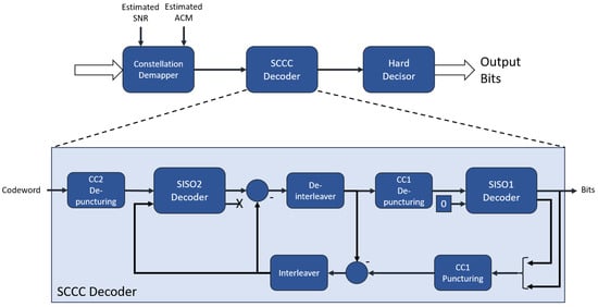 Specifically, the demapper block aims to transform the constellation symbols, corrected by the demodulator blocks, into soft bits represented as LLRs. Then, the SCCC decoder block eventually corrects transmission bit errors, providing the correct information bits. Figure 5 shows the architecture of the implemented back end, with a focus on the internal architecture of the SCCC decoder.