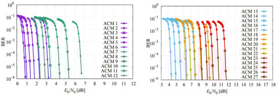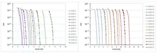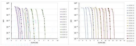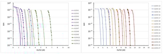 To evaluate the error correction performance of the system, the BER was computed, applying AWGN impairment to the input and modifying the applied signal-to-noise ratio (Eb_N0) to produce the so-called BER curves. The BER curves show the decrease in the error rate when increasing the Eb_N0, hence the number of symbols with respect to the noise. BER curves have been computed for all the ACM, considering at minimum a number of 1000 PL frames as input, and for all the GPU implementation, to show the implementation loss introduced by optimizing the code. The ideal BER curves are defined in the CCSDS 130.11-G report [36] and are depicted in Figure 6.