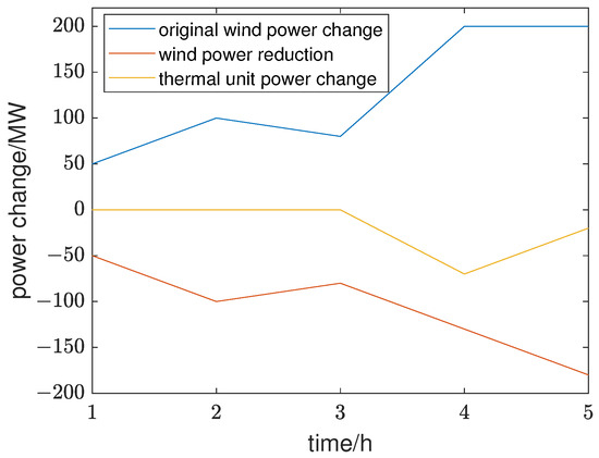 Initially, the interconnected system achieves the power balance by satisfying . For the convenience of analysis, we assume that the load demands remain constant, i.e., . As is shown in Figure 1, from 1 h to 5 h, the wind farm output power fluctuates by 50 MW, 100 MW, 80 MW, 200 MW, and 200 MW, respectively. From 1 h to 3 h, the wind power ramp (i.e., 50 MW, 50 MW, and −20 MW) is no bigger than the ramp limit 50 MW of the thermal unit; hence, the thermal unit power changes by −50 MW, −100 MW, and −80 MW to guarantee the power balance . Nevertheless, from 4 h to 5 h, the wind power ramp 120 MW surpasses the ramp limit 50 MW of the thermal unit; hence, even if the thermal unit reduces the power with a ramp limit of 50 MW, a power surplus of 70 MW and 20 MW at 4 h and 5 h, respectively, still exists. Therefore, the wind power reduction is 70 MW and 20 MW to rebalance the power. Meanwhile, the wind power reduction can control the wind power ramp from the original MW to the smoothed MW. In practice, wind power ramp control is more challenging for the following reasons: