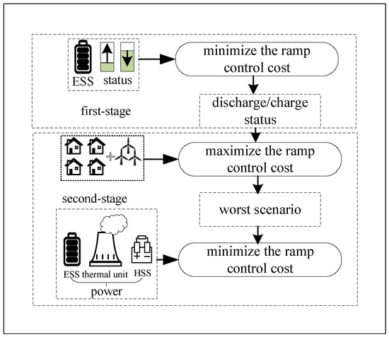 where corresponds to the outer layer constraint and corresponds to the inner layer constraint. As the middle layer decision variable is an uncertainty set (e.g., a discrete set or a polyhedron), Equation (6) incorporates both the middle layer and inner layer decision variables. represents the operational states of the system and ramp control sources. From (4) to (6), we can see that the control center decides the first-stage and second-stage decision variables, sequentially considering the worst scenario, such that the ramp control cost is minimized. The strategy under the worst scenario has robustness under other uncertain scenarios to guarantee the secure operation under different levels of uncertainties. The schematic diagram of the two-stage RO-based ramp control framework is provided in Figure 3. After obtaining the optimal power schedule, the dispatch center sends the optimal power order to the respective regulation source, including thermal units and ESSs. As for asynchronous machines such as ESSs, converter-cell power of ESS will track the optimal power order using the active power control system of converter cells [29,30,31,32].