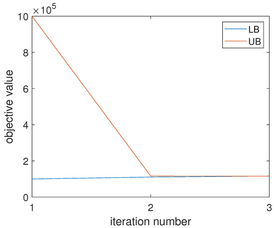 - Step 1: initialize the upper bound and lower bound ; the iteration number ; the maximum iteration number is . Initialize the worst scenario .