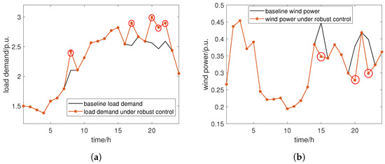 In order to simulate the uncertainties of wind power and load demand, the uncertainty factors were and . Figure 5 provides the iteration process based on the C&CG algorithm, which shows that the computation reached convergence after two rounds of iteration. Figure 6 shows the wind and load demand power profiles with and without robust ramp control. The black line represents the baseline load and wind power profiles without uncertainty. In other words, the middle layer cannot be changed, but remains at the baseline values. Considering the uncertainties, the orange line represents the wind power or load demand power profile under robust ramp control. Figure 6a shows that the load demand under robust control deviates from the baseline load at five time points, corresponds to . In other words, under constraint (24), five of , are set 1 to reach the upper boundaries of the load prediction interval. Similarly, Figure 6b shows that the wind power under robust control deviates from the baseline load at 3 time points, which correspond to . In other words, under constraint (22), 3 of are set 1 to reach the lower boundaries of the wind power prediction interval. The upper and lower boundaries form the worst scenario, corresponding to the middle-layer max operator.