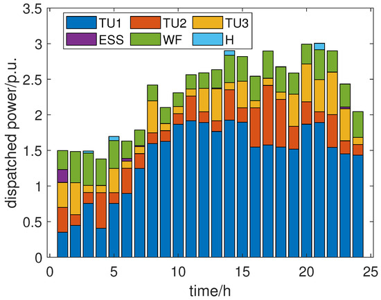 Figure 7 provides the dispatched power of the ramp control sources after implementing robust ramp control strategies. TU1, TU2, and TU3 represent thermal unit 1, thermal unit 2, and thermal unit 3, respectively. Figure 7 shows that the a portion of wind power converts to hydrogen energy at 3 h, 5 h, 14 h, and 21 h, which were the very times the wind power experienced abrupt change shown in Figure 6b. Therefore, the excessive wind power was converted to more profitable hydrogen energy. ESS discharged power at 1 h, 6 h, 7 h, and 24 h, which corresponded to the generation insufficiency time points due to either the load increase, wind power decrease, or thermal unit ramp limits. Among the three thermal units, TU 1 shared the highest portion of power dispatch due to the cheapest cost. Figure 8 provides non-smoothed and smoothed wind power profiles. As can be seen, in contrast with the non-smoothed wind power (the orange line), abrupt changes in wind power that are smoothed by HSS and ESS (the blue line) significantly decreased.