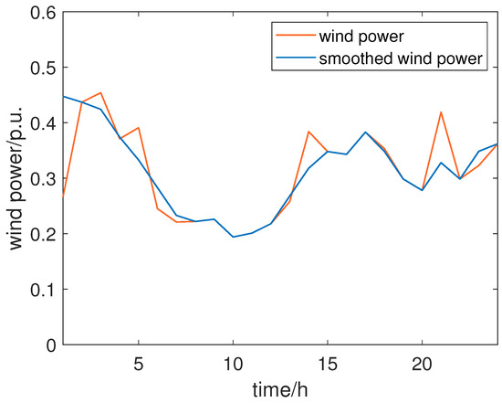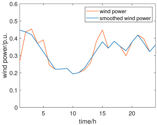 Further, we considered the deterministic situation without wind power or load demand uncertainty, i.e., , and . Figure 9 provides the dispatched power of ramp control sources after implementing deterministic ramp control strategies. Figure 10 provides non-smoothed and smoothed wind power profiles under deterministic ramp control. Compared with the dispatched power under robust ramp control in Figure 8, the overall dispatched power under deterministic ramp control of different sources did not significantly change. This was because load demands considering uncertainties and without considering uncertainties had no significant difference. The total ramp control cost CHY under deterministic ramp control was smaller than the total ramp control cost CHY, meaning that the operator caused extra costs to handle the worst scenario (maximum load minus minimal wind power) under robust ramp control. Further, when no HSS participated in the ramp control, the total ramp control cost considering uncertainties (, and ) was CHY, which increased by compared with the total ramp control cost CHY with the participation of HSS. This proves that the extra profit from selling hydrogen using HSS can further reduce the ramp control cost and improve the economic performance.