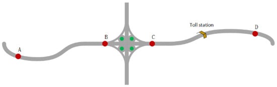 The road traffic flow prediction algorithm based on graph neural networks is currently a high-precision, data-driven, and short-term traffic flow forecasting method. However, it has two main shortcomings. Firstly, the generation of the road traffic graph structure relies primarily on prior theoretical knowledge, which may not adequately reflect the connectivity between nodes. If the relationship between nodes relies on the distance of the nodes, this relationship will deviate significantly from the actual situation, as shown in Figure 1. In Figure 1, while the distance between areas B and C appears short, there is a diversion area between them that may weaken their connection relative to the connection between A and B. Similarly, the presence of a toll station between C and D can significantly affect the relationship between them, with this influence manifesting at both static or macro-levels and dynamic or micro-levels. Zhang et al. [] addressed this issue by proposing a self-learning graph structure that leverages multiple sources of prior knowledge as the starting point for graph structure self-learning. During the model training process, they performed alternating iterative optimization of graph structure parameters and traffic flow prediction model parameters based on the loss function. The judicious selection of prior knowledge holds significant importance in the process of self-learning for graphs. Inappropriately chosen prior knowledge may lead the model into inappropriate local optima during self-learning, constraining the ultimate precision achievable by the model. Given the context of employing a time-based tolling strategy for the proactive regulation of recurrent road traffic congestion, incorporating the tolling strategy as prior knowledge in the self-learning graph is anticipated to enhance the model’s training effectiveness. The second issue lies in the static nature of the graph structure of the road traffic network, which fails to adapt dynamically to temporal changes and respond effectively to unforeseen events on the roads. Figure 2 further illustrates how the relationship between areas can be influenced by various factors and can change over time. In Figure 2a, it is evident that the interregional traffic relationships are subject to the influence of changes in toll collection status, whereby the price change of toll collection at specific road sections may alter traffic flows and, consequently, impact traffic relationships. In Figure 2b, the time-varying nature of traffic relationships is demonstrated, whereby the relationships between areas can be modified by traffic management policies, such as road repair or road closures. Finally, Figure 2c shows how traffic congestion or road construction can affect the relationships between areas over time, leading to changes in traffic patterns and potentially altering the dynamics of traffic flow. To address this concern, Ta et al. [] proposed a solution by introducing a micro-level self-learning graph structure. This approach involves real-time adjustments to the graph structure based on the fluctuations in node traffic flow, thereby enhancing the model’s ability to accommodate temporal variations and promptly react to unexpected road conditions. Additionally, with regard to the road traffic flow prediction module of the graph neural network, in the context of employing tolling schemes to regulate recurrent road traffic congestion, the current tolling policies on the roads can significantly influence the travel strategies adopted by users. Therefore, in the process of road traffic flow prediction, due consideration should be given to the impact of the prevailing congestion pricing schemes on the road traffic volume.