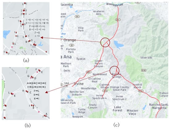 The toll graph structure involves describing the toll scheme between nodes. In many cities, the toll scheme for toll roads varies depending on the time and section of the road. Toll fees are determined by the administrative departments by setting certain toll stations on toll roads. Typically, users are required to pay the corresponding road toll each time they pass through a toll station. As these toll nodes are distributed among the detector nodes, we convert the road toll information provided by the toll stations into a connection relationship between the detector nodes. Using Orange County as an illustrative example, this issue is elaborated in detail in Figure 4 and Table 1 in the scientific context. Figure 4 shows the distribution of toll stations in Orange County and Table 1 is a portion of the toll rates for roads, which were obtained from https://www.thetollroads.com (accessed on 21 January 2023).