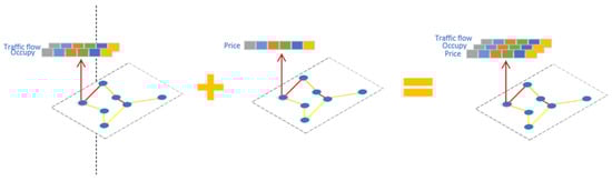 The input data for the model consists of toll collection data and road traffic flow data from the Orange County region in the United States. The data utilized in this study were obtained from two distinct sources: the Performance Measurement System (PeMS) (available at https://pems.dot.ca.gov/, accessed on 21 January 2023) and The Toll Roads of Orange County (available at https://www.thetollroads.com, accessed on 21 January 2023). The PeMS is an extensive database of traffic information collected in real-time every 30 s by Caltrans on state highways across California, in addition to other Caltrans and partner agency data sets. The data were aggregated into 5 min intervals from raw data and encompass over 39,000 detectors installed in the major metropolitan areas of California. The Toll Roads of Orange County is a website that provides comprehensive road toll information for SR241, SR261, SR133, and SR73 in Orange County, California, USA. To perform our experiments, we employed crawlers to acquire traffic data, including the total flow and occupancy of 211 detectors in Orange County from the PeMS. Total flow denotes the total number of vehicles that passed through the corresponding detectors in a 5 min period. The detectors installed in the PeMS measure the time taken for a vehicle to pass over them, termed occupancy, which can be employed to calculate other performance measures, such as speed and delay. Moreover, as shown in Figure 6, we manually combined the road toll information as one of the node data with the total flow and occupancy. The data in this study spanned from 4 July 2022 to 4 September 2022. We partitioned the data into training, validation, and testing sets at a ratio of 6:2:2, respectively. Details of the data set are shown in Table 2.