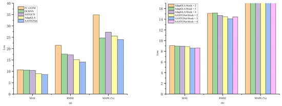 Performance analysis of the models under different conditions: (a) a performance comparison of different deep learning models under the premise that only nodes that are greatly affected by price information are considered and (b) a performance comparison between AASTGNet and AdapGLA when different numbers of spatiotemporal convolution blocks are set.