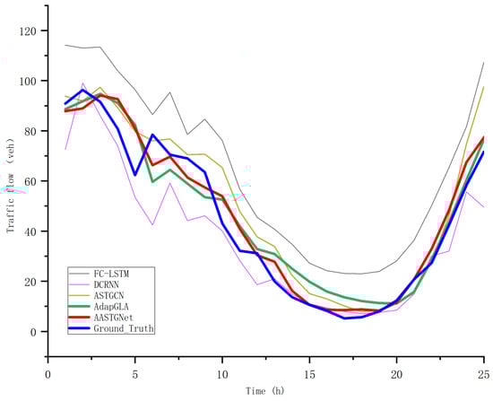 To further illustrate the advantages of AASTGNet over other models for traffic flow prediction, we plot the prediction results of multiple models for the next hour at a node against the ground truth in Figure 9. As depicted in Figure 9, the optimal graph structure, benefitting from ample graph self-learning, demonstrates enhanced guidance for road traffic flow prediction. Notably, both the red curve representing AASTGNet and the green curve representing AdapGLA exhibit higher accuracy compared to other models. It is clearly illustrated that in the face of sudden fluctuations, the green curve representing AdapGLA fits the true curve relatively poorly, while the green curve representing AASTGNet has a better fit in the face of sudden arriving peaks.