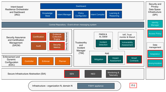 Figure 1. It consists of the following set of building modules: (1) Intent-based Resilience Orchestrator and Dashboard (IRO), (2) Security Assurance and Certification Manager (SACM), (3) Trust and Incident Manager (TIM), (4) Enforcement and Dynamic Configuration (EDC), (5) Security and Privacy Data Space Infrastructure (SPI) and (6) Secure Infrastructure Abstraction (SIA).