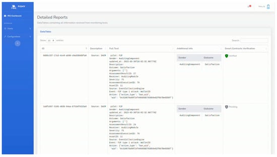 Figure 3. The instance presented here shows the events (one per row) detected by FISHY and their details as well as whether this event has been registered in the FISHY blockchain network (indicated by the green (check mark) symbol on the right-hand side of the event). This will trigger the IRO so that the relevant intent is identified, and a policy is suggested to the F2F platform operator. Once (s)he confirms (s)he agrees for the enforcement of the policy, the EDC undertakes its translation into a low-level policy, and it is passed to the F2F platform.